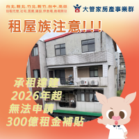 大管家讓您不再遇到惡房客、不怕租金糾紛「租屋不再像鬼故事」讓房東、房客放心房子找對人才安心!房東快來詢問大管家節省每月1.5萬元租金所得稅房屋稅優惠稅率1.2%、地價稅減徵每年跟政......