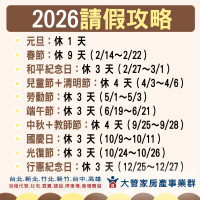 準備好你的行事曆了嗎?房東最擔心的事,交給專業包租代管聰明休假,一年出國玩10 次不是問題!2026 連假亮點• 元旦:休 1 天• 春節:休 9 天(2/14~2/22)• 和平紀念日:休 3 天......